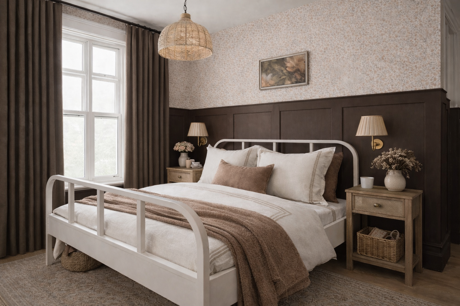 This guest room scheme embraces a soft and whimsical aesthetic, combining warm neutrals with layered textures to create a restorative space. A muted palette of creams, taupes and gentle browns was proposed to compliment the delicate patterned wallpaper. A traditional wall panelling detail was added for visual interest. The white bedframe creates a focal point, softened by natural wood tones and woven elements, creating a mood that feels both elegant and effortlessly relaxed.